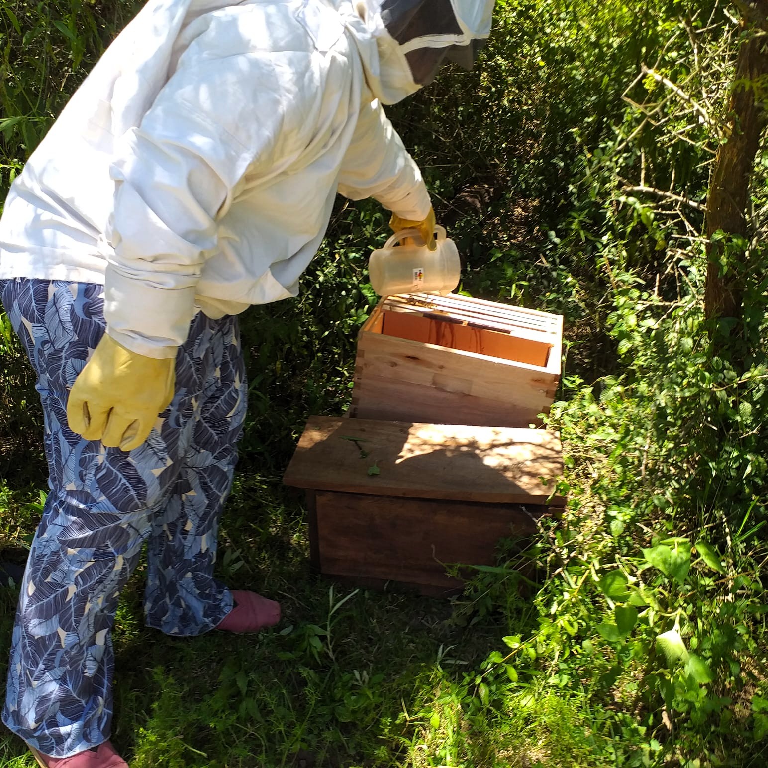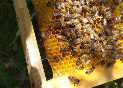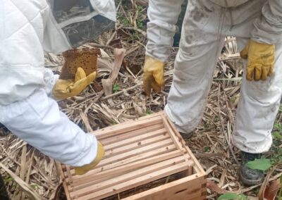 Por ahora, las familias cuentan con cinco cajones distribuidos en dos apiarios. Están en plena etapa de captación de enjambres en nucleros –cajones rústicos del monte– y aprendiendo el trasiego, que es el traslado del panal a los cajones definitivos. “Si el clima acompaña, la idea es comenzar la cosecha a comienzos del año que viene”, adelantó.